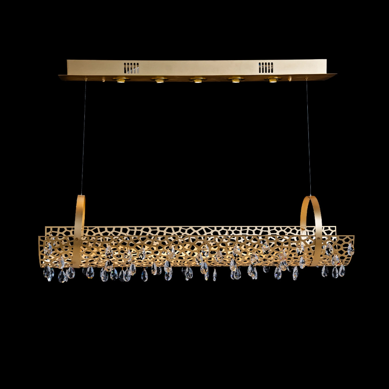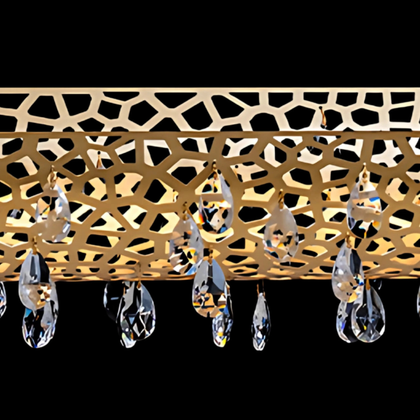 Delores captures bold sophistication through an intricate lattice design, inspired by mosaic patterns and sculpted in 24K gold-plated metal. Five integrated LED lights illuminate a ribbon of Almaza™ lead crystal drops, bringing radiant sparkle and motion to this modern centerpiece. Its structural elegance and reflective geometry make it a luxurious choice for contemporary living spaces.