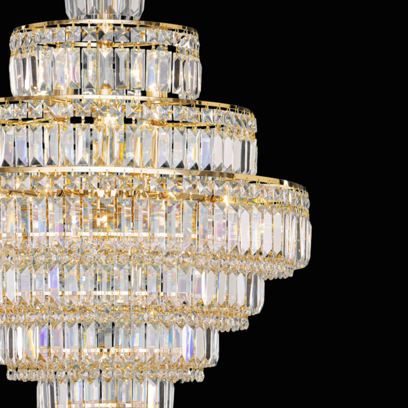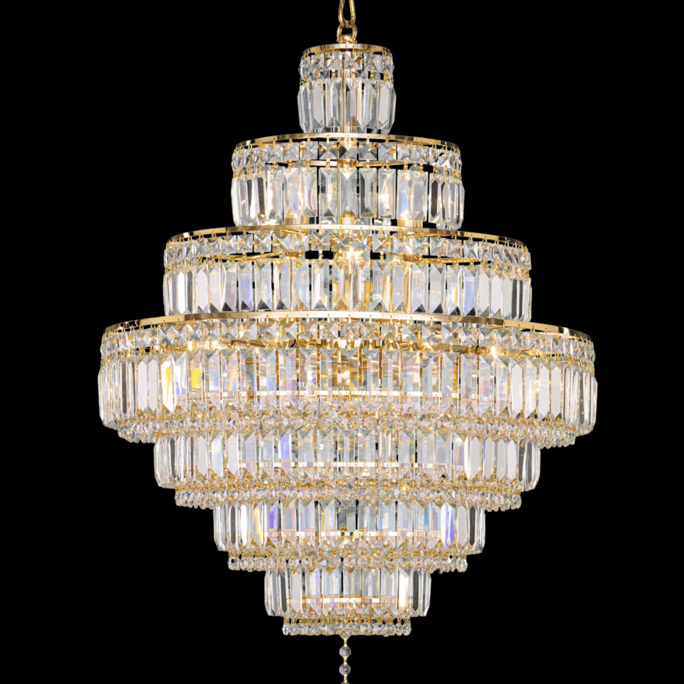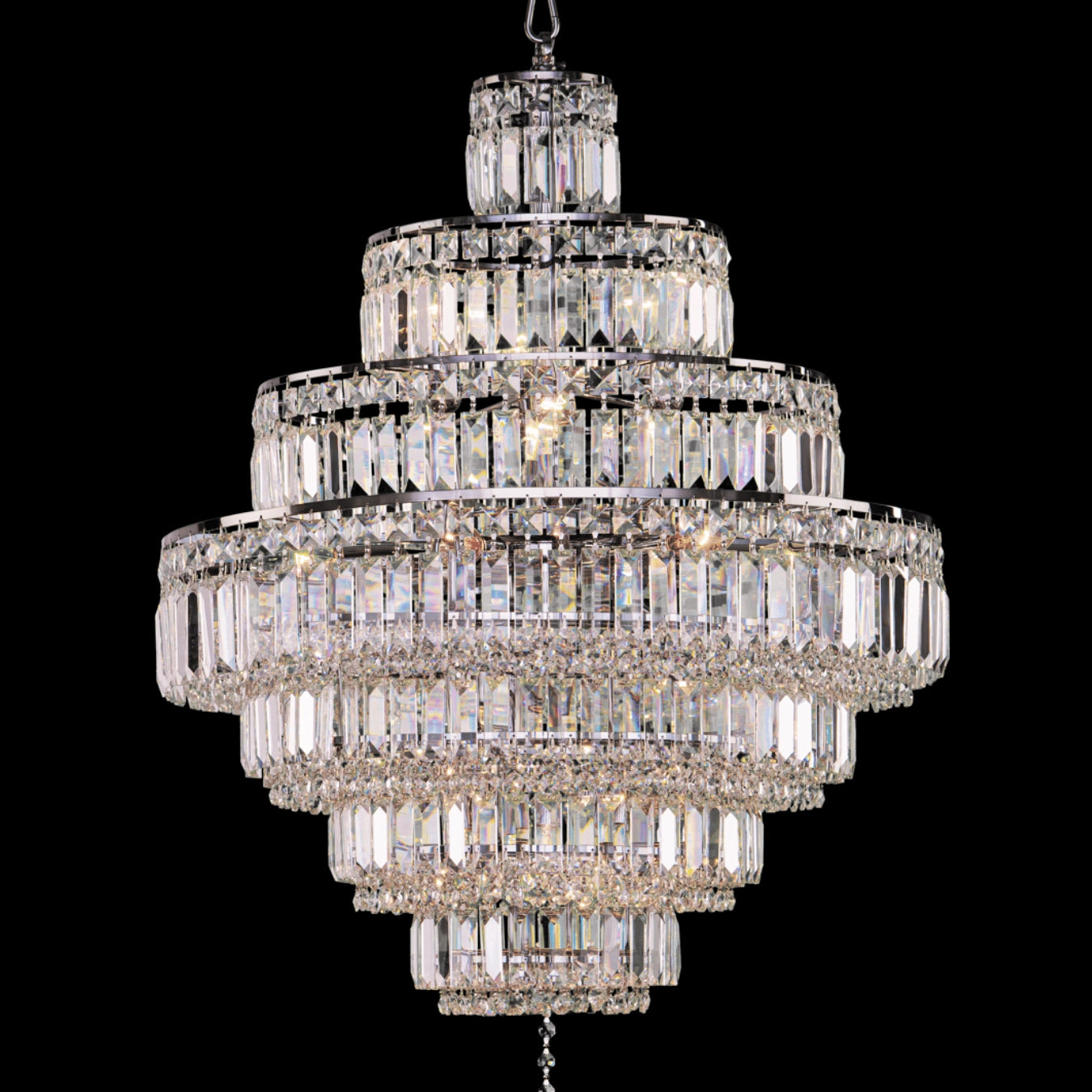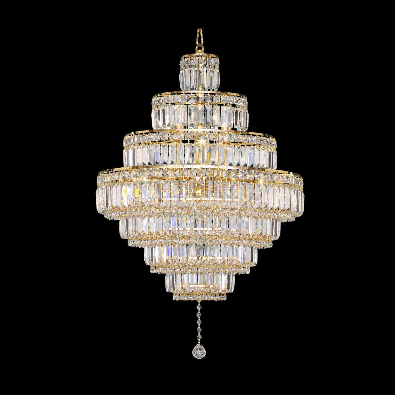 Elysian evokes the architectural elegance of imperial ballrooms. With 18 radiant bulbs and cascading layers of pendeloque-cut Almaza™ crystals, this Empire Collection chandelier creates a column of golden brilliance. Framed in chrome or gold, its symmetrical silhouette lends regal symmetry to grand interiors while reflecting the refinement of timeless design.