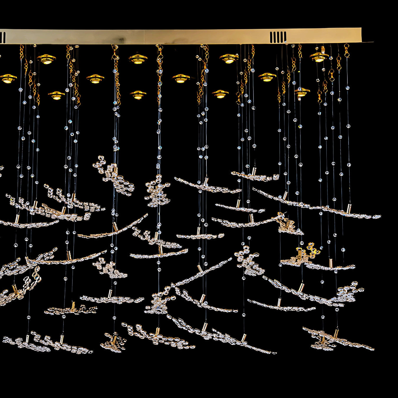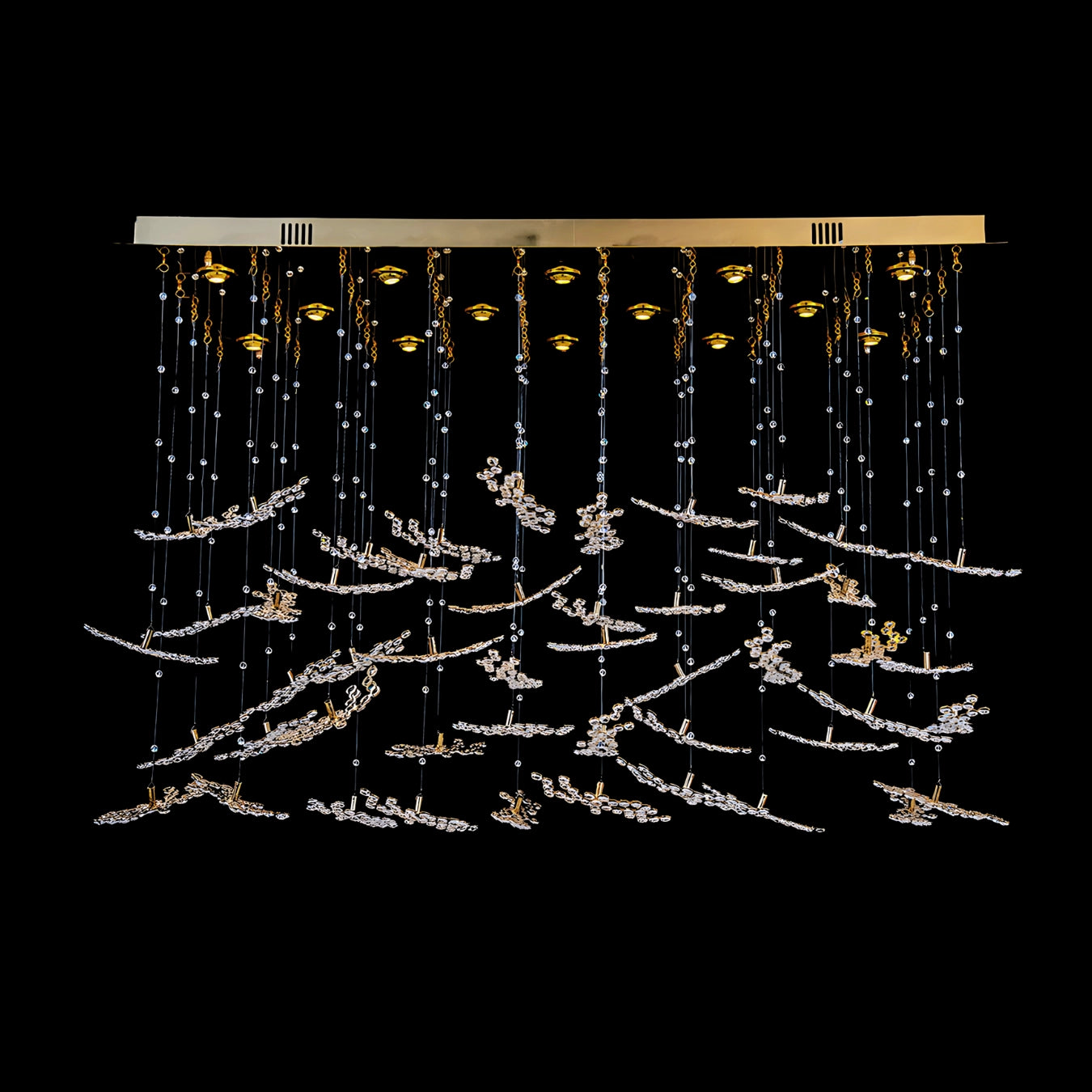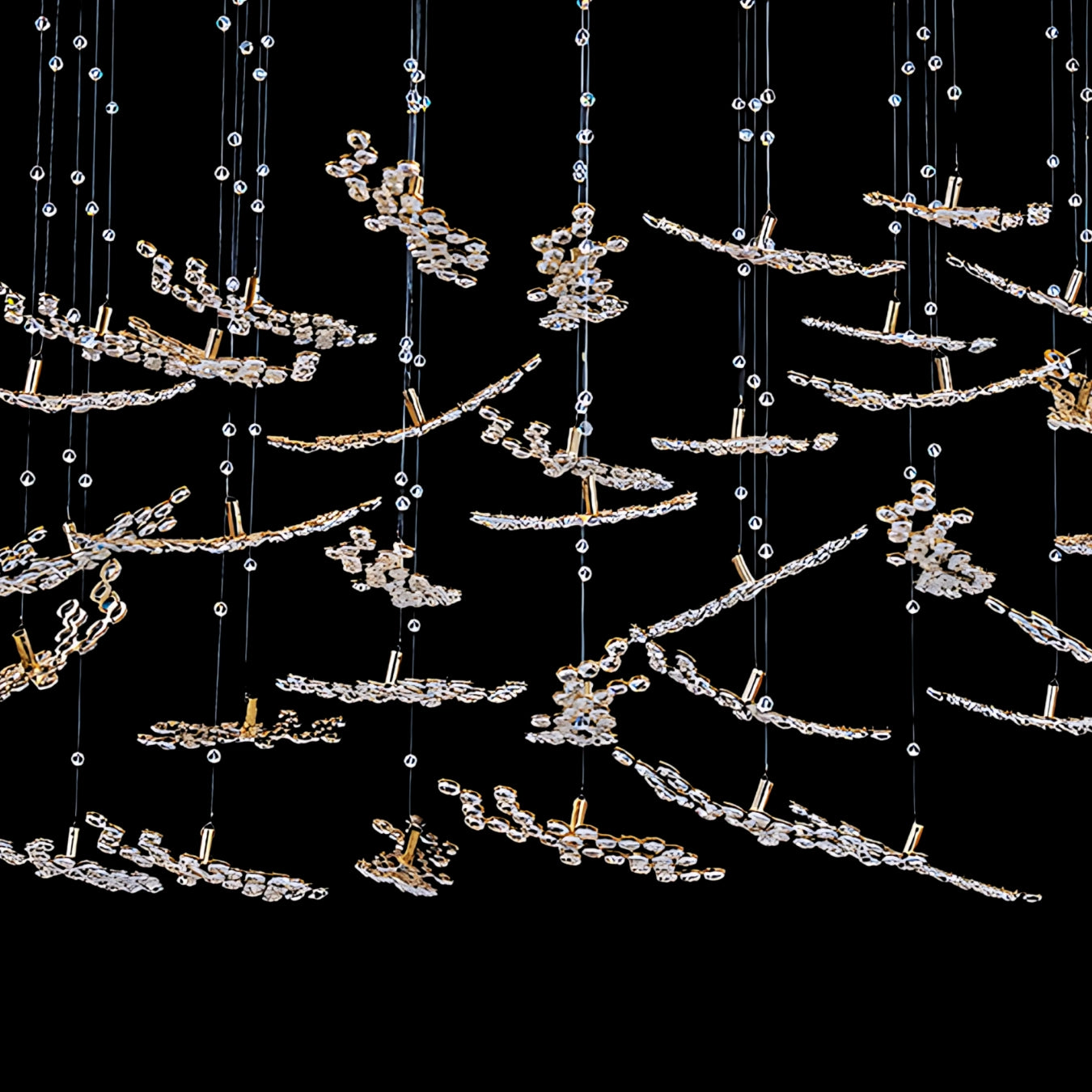 Lucent floats like a golden breath of air, delicate yet commanding. Suspended along its sweeping frame, the crystals shimmer with quiet intensity, as if stirred by an unseen breeze. Each detail, from its elongated body to its rhythmic light, evokes the elegance of a starlit evening: graceful, luminous, endlessly modern. Lucent is not merely a chandelier, but an atmosphere.
