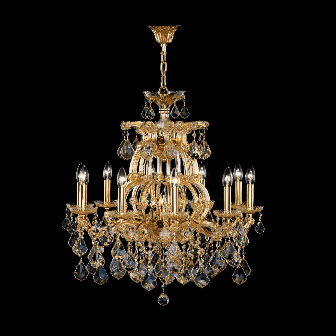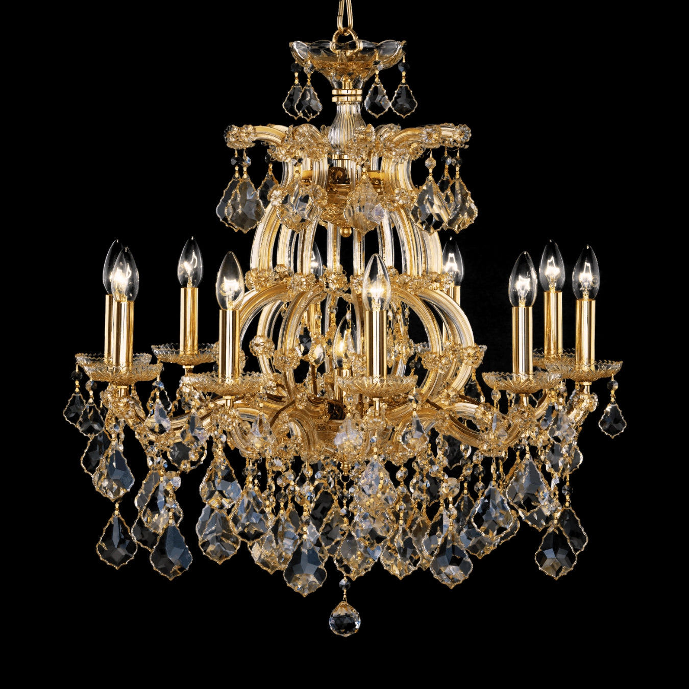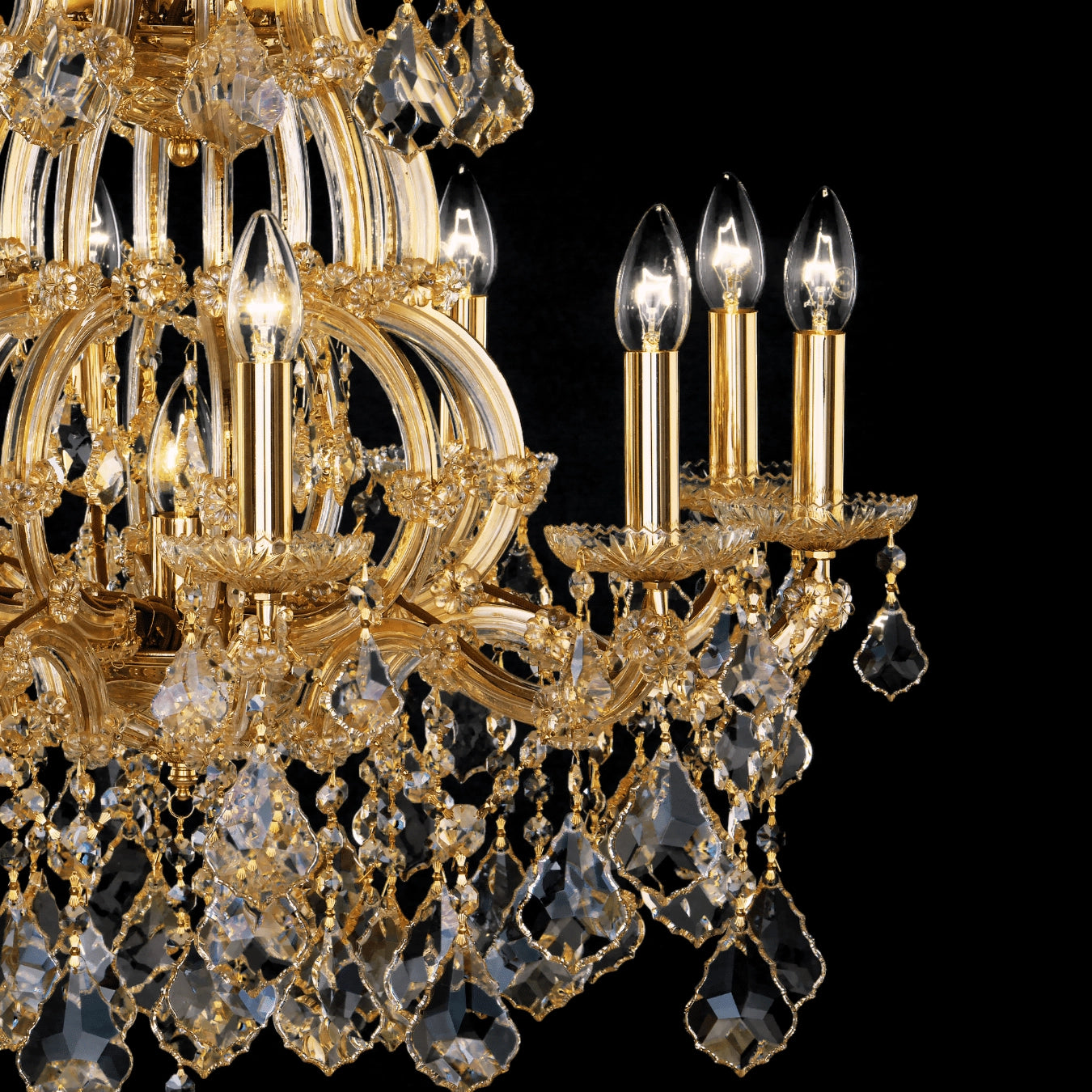Maria Theresa No.10 blends imperial grandeur with meticulous craftsmanship. With 11 shimmering lights and pendeloque-cut Almaza™ crystals in golden shadow finish, it casts a warm, regal glow across any interior. A 24K gold-plated frame completes this timeless statement of elegance.