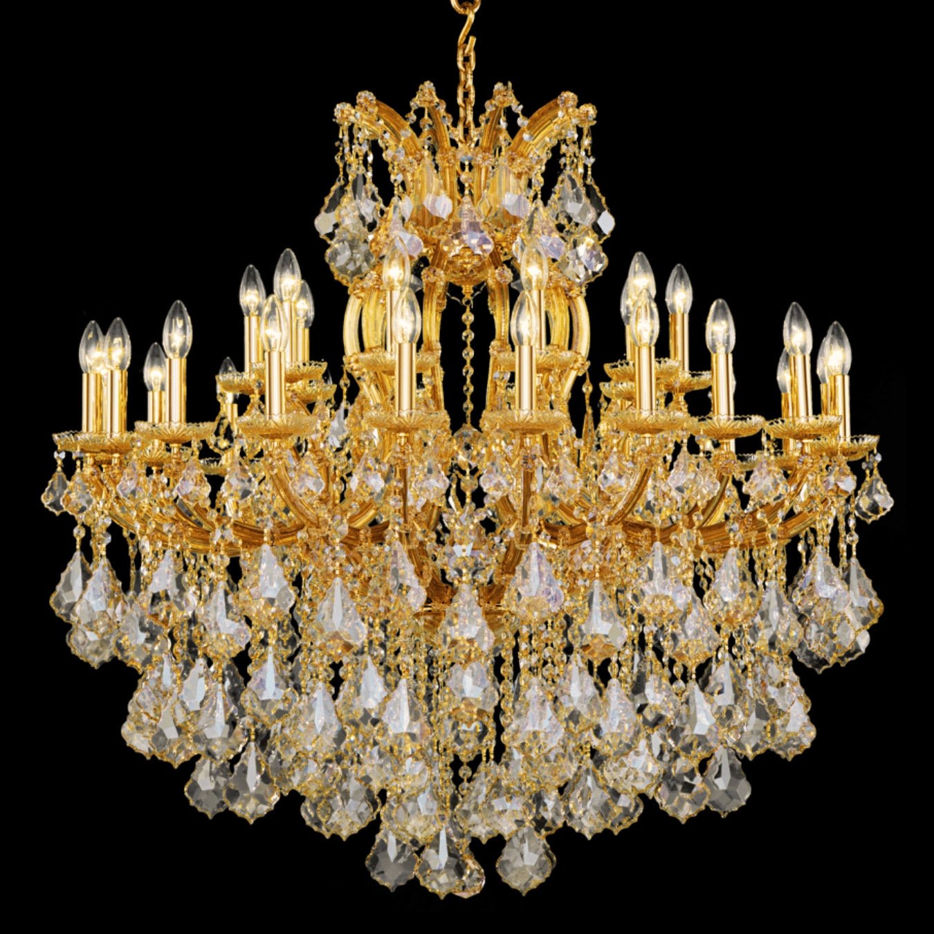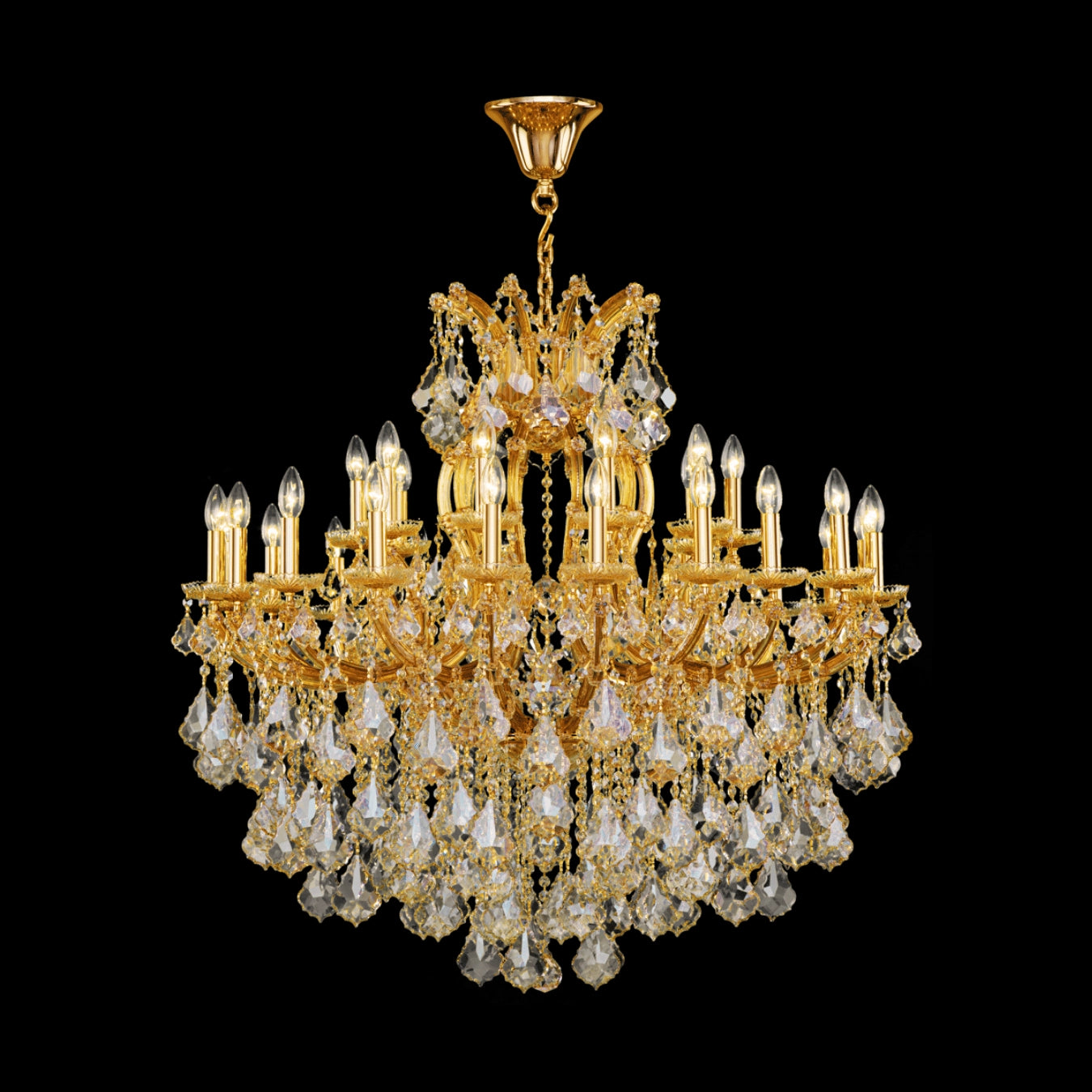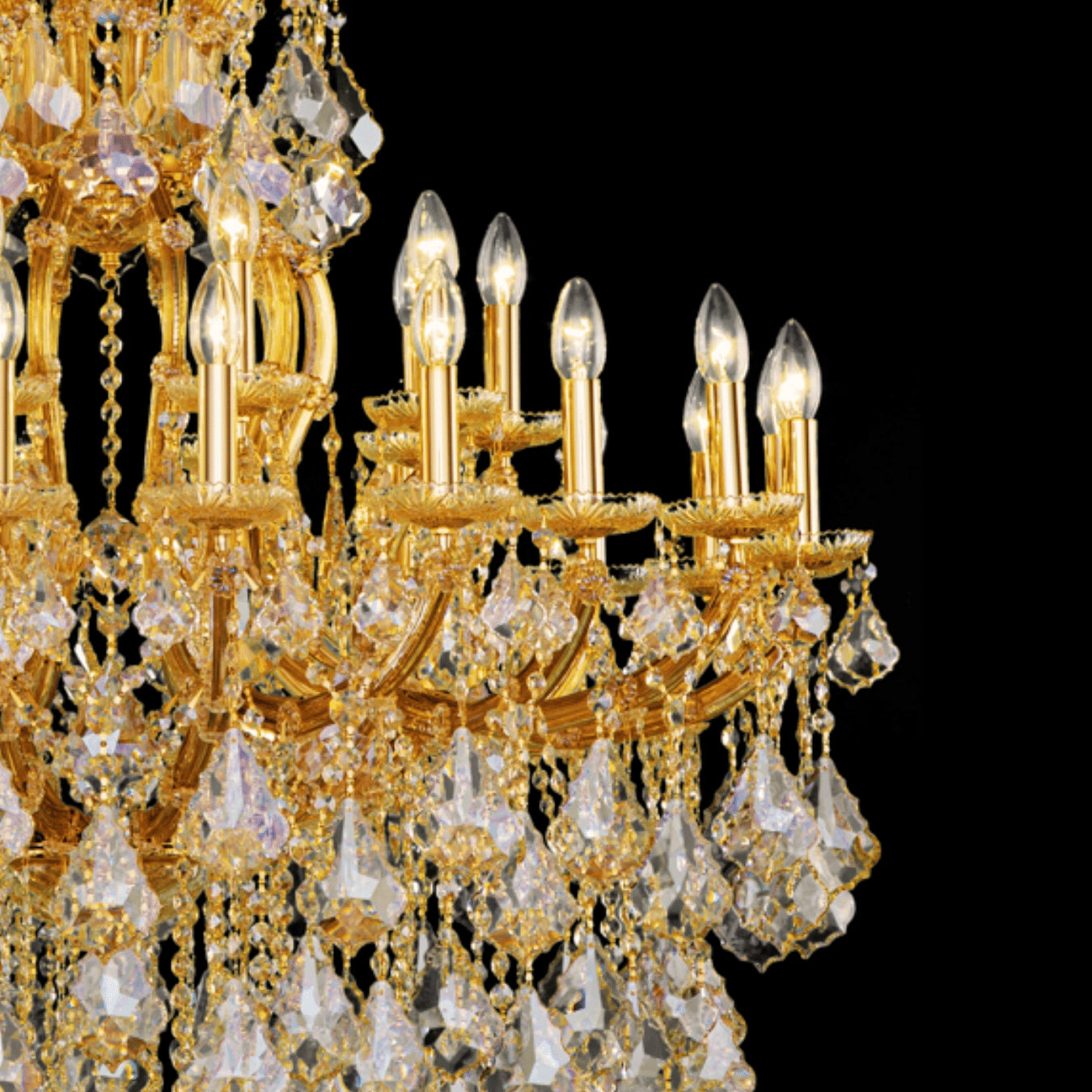 Maria Theresa No.107 blends imperial grandeur with meticulous craftsmanship. With 30 shimmering lights and pendeloque-cut Almaza™ crystals in golden shadow finish, it casts a warm, regal glow across any interior. A 24K gold-plated frame completes this timeless statement of elegance.