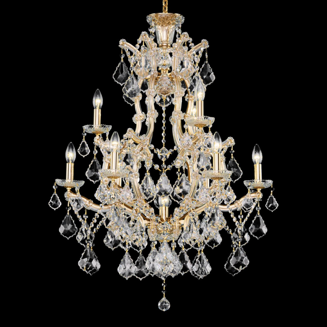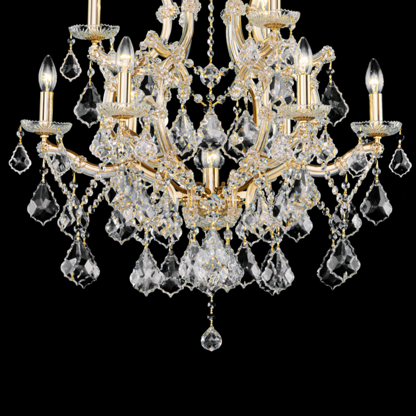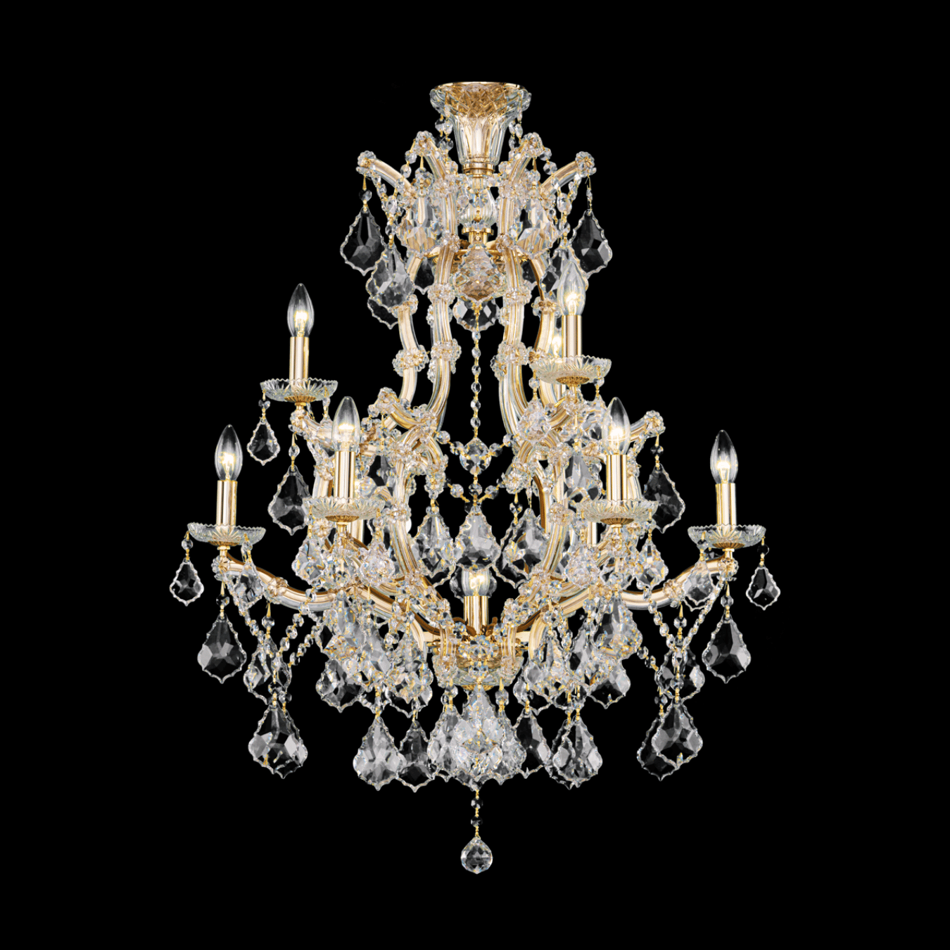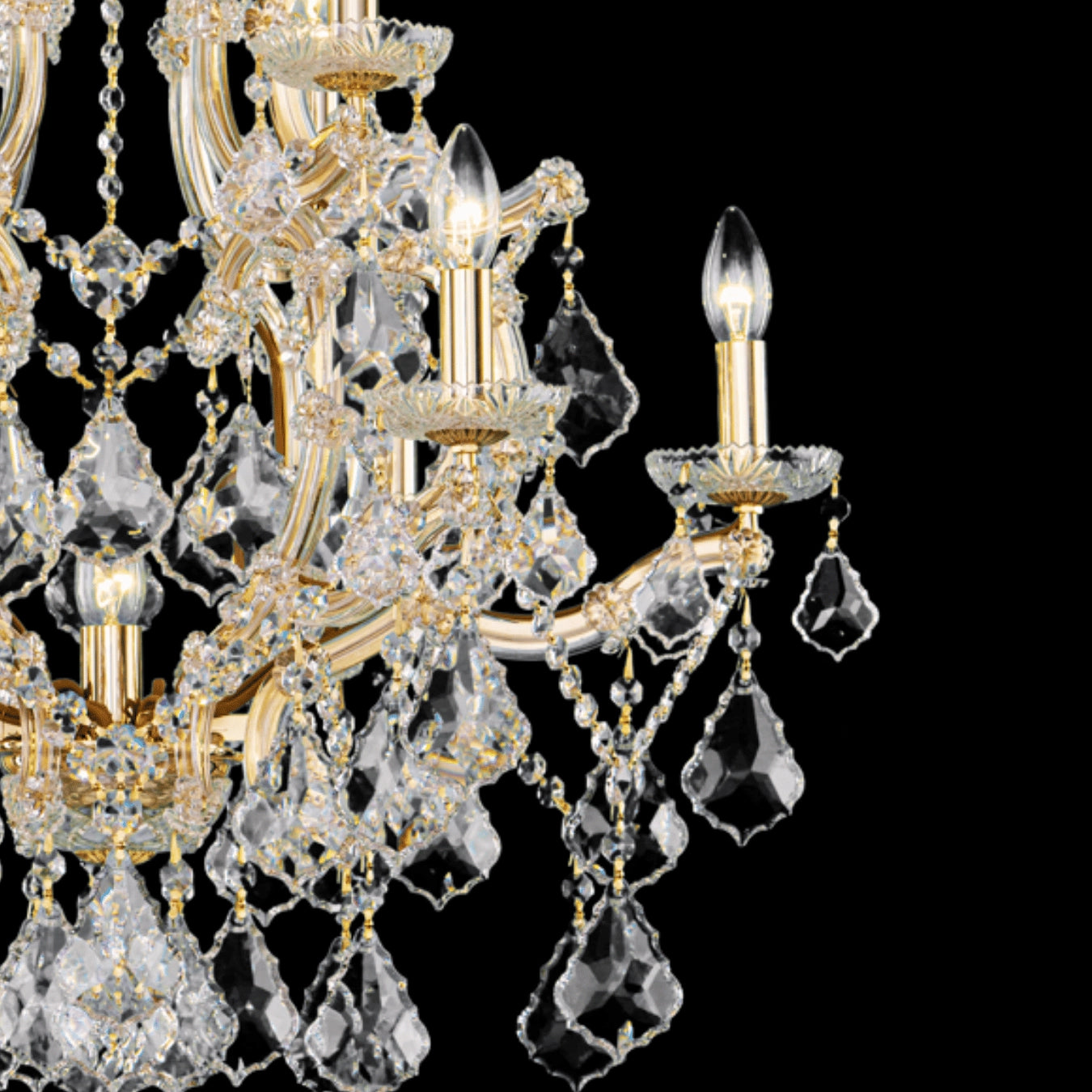 Maria Theresa No.30 blends imperial grandeur with meticulous craftsmanship. With 10 shimmering lights and pendeloque-cut Almaza™ crystals in a clear finish, it casts a refined glow across any interior. A 24K gold-plated frame completes this timeless statement of elegance.
