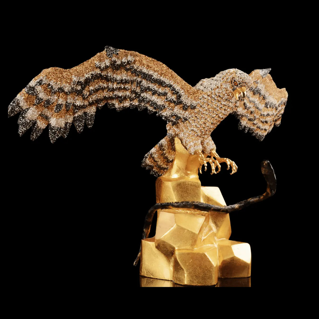 Predator’s Pursuit captures the raw force and precision of nature’s fiercest hunter. Handcrafted over 105 working hours, this commanding falcon sculpture features 73,590 Asfour crystal pieces in black, clear, yellow, and gold tones. Wings extended in full span, it freezes the moment before the strike, talons drawn and eyes locked with intent. Perched on a faceted golden rock and coiled with a sleek serpent, every angle speaks of motion and instinct.
