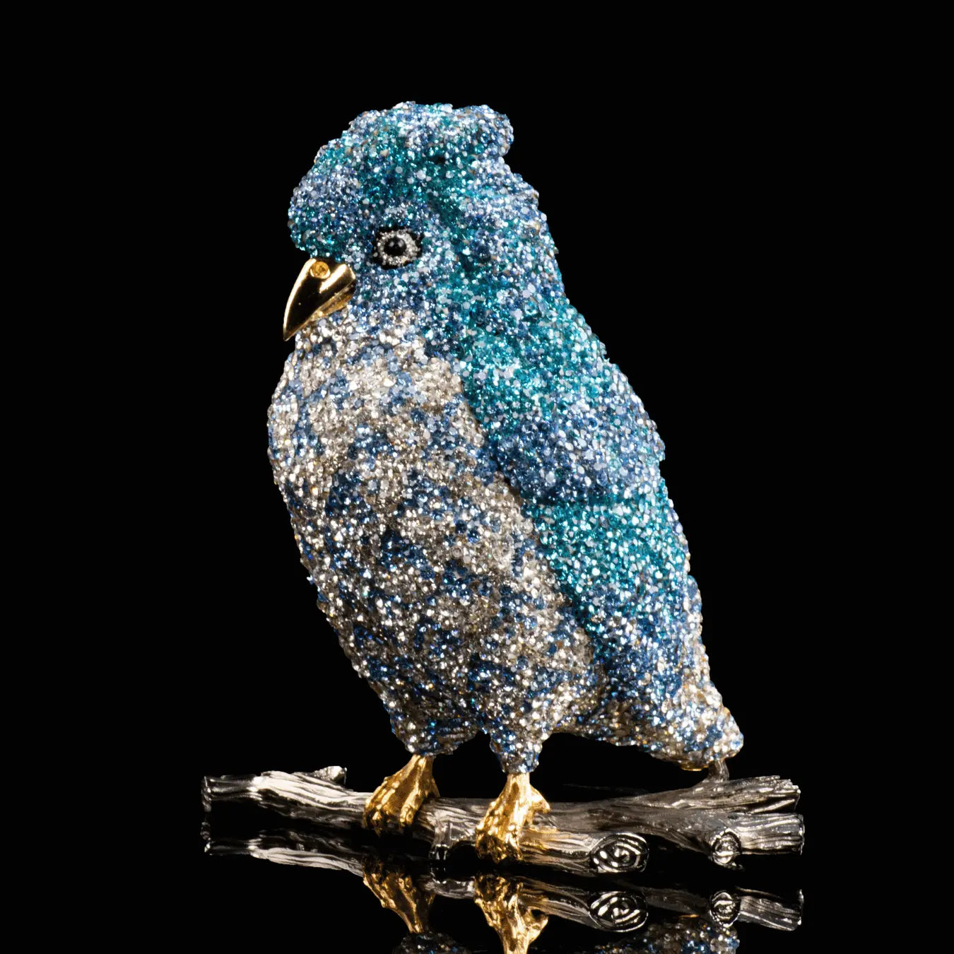 Meet Solae, a baby bird sculpture inspired by the gentle charm and alert stance of the blue jay. With its wide eyes and snowy white crest, this handcrafted piece radiates innocence and serenity. Cloaked in 8,034 baby blue and white Asfour crystals, Solae is delicately perched on a silver-finished branch, adding a subtle metallic contrast to its soft shimmer. Crafted over 14 hours, it reflects the calm beauty of still moments in nature. Both playful and poetic, Solae brings a sense of quiet joy and grace to any interior.