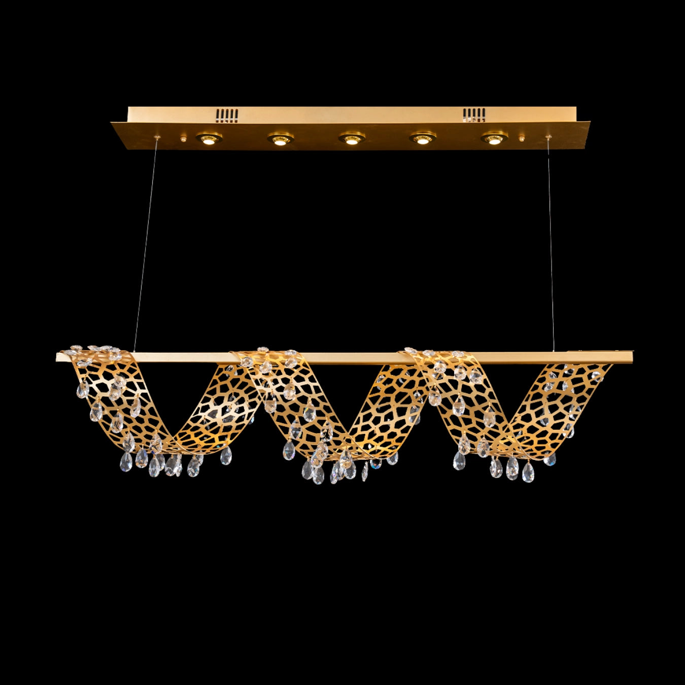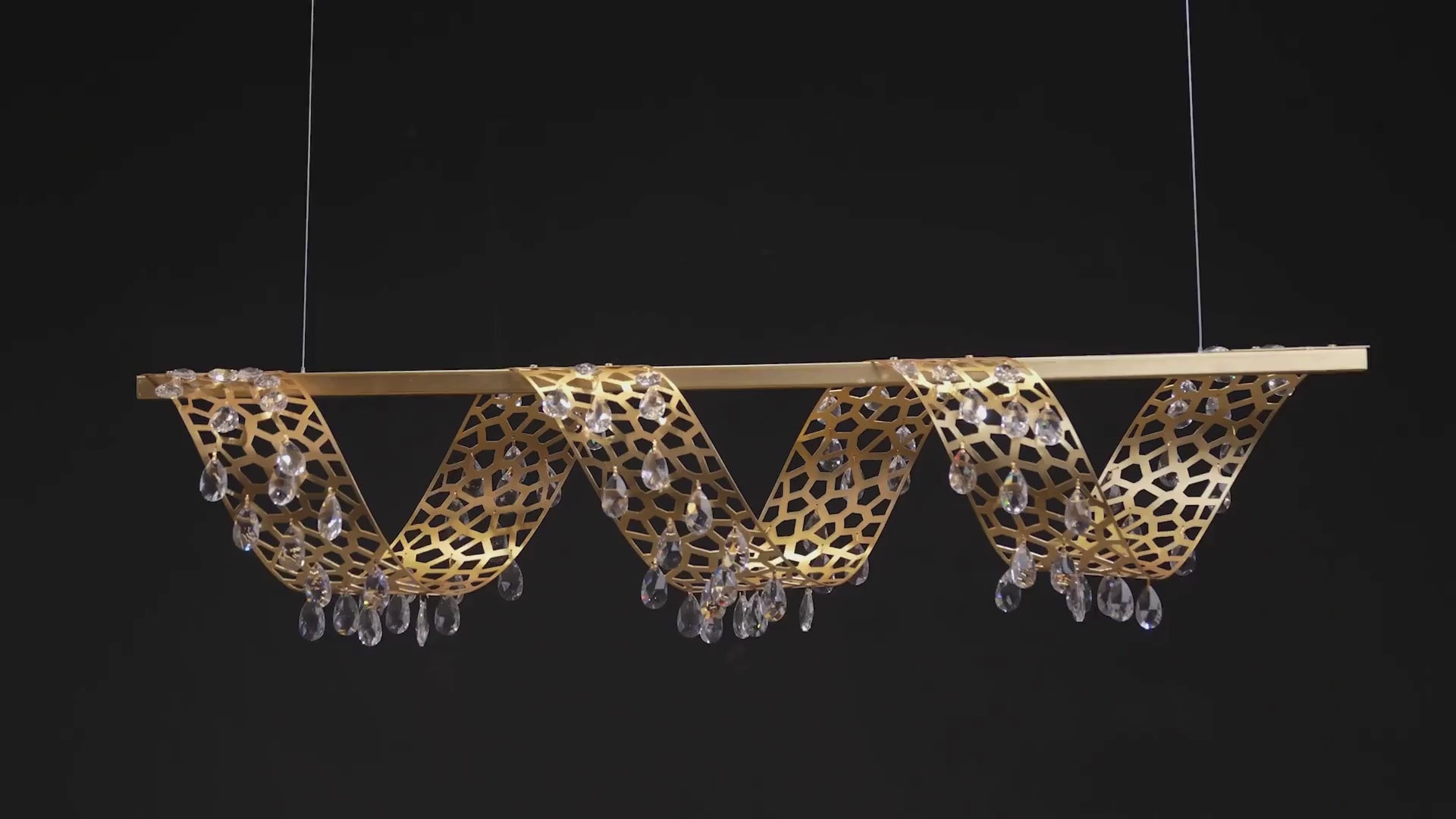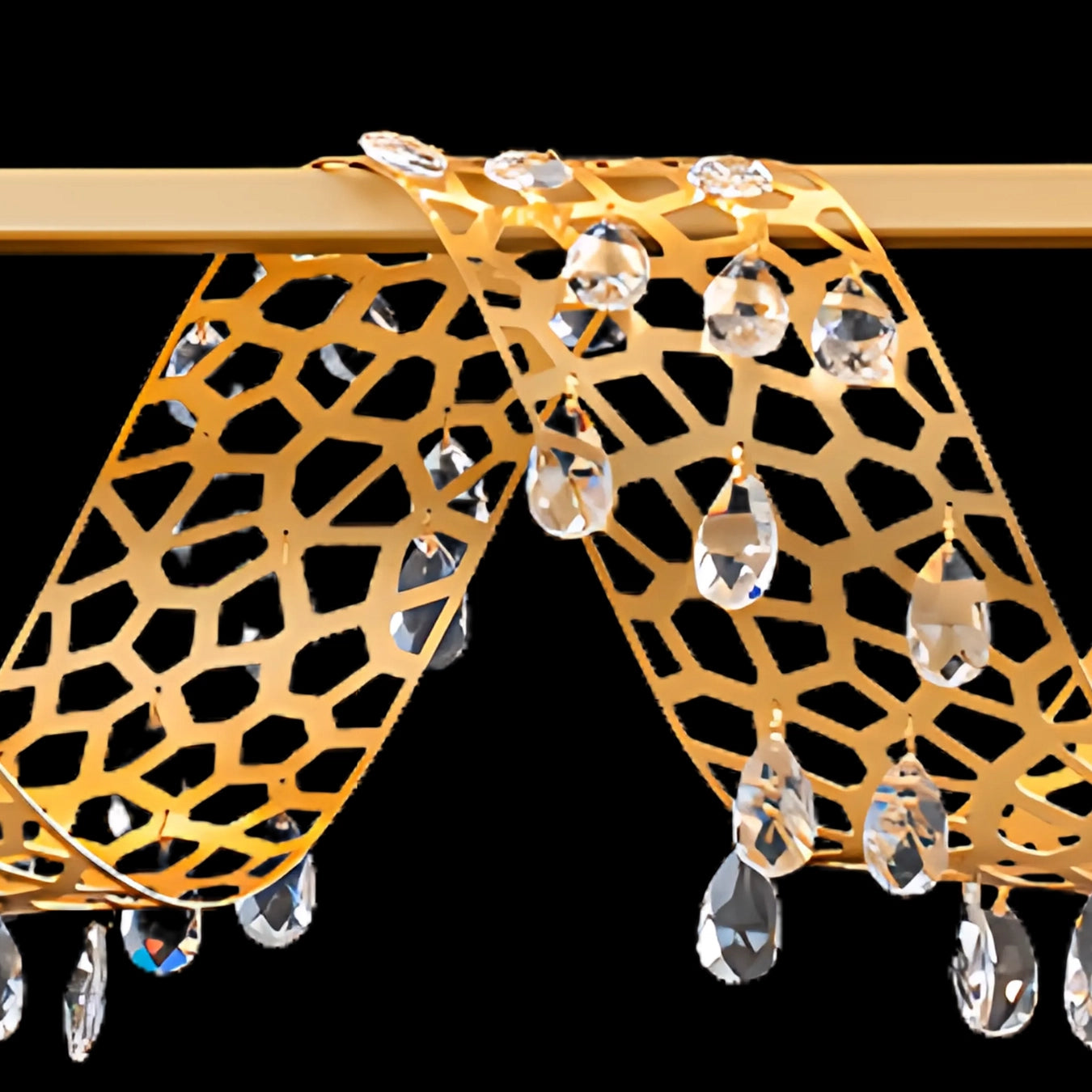 Odette evokes the poise of a silk ribbon caught mid-drift. Crafted in a mosaic gold lattice and adorned with pure Almaza™ drop crystals, this design blends geometric precision with poetic motion. Light flows along its folded silhouette like water over golden fabric, casting radiant patterns across the room.